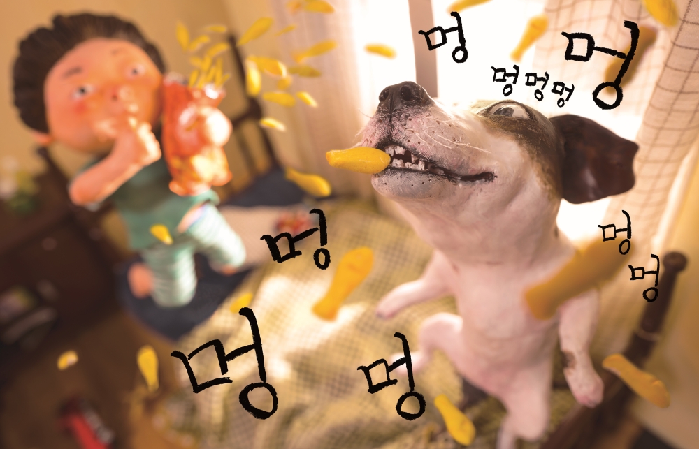 In later books—such as Jang-su-taang seon-nyeo-nim (2012, Bath Fairy), Al-sa-taang (2017, Magic Candies) and Na-neun ghe-dah (2019, I Am a Dog), Baek Heena’s characters become even more expressive. They have firm bodies sculpted from clay, accentuating their anatomy, body language and facial features. The settings, too, evolve toward a more animated and cinematic style, using varied lighting, visual depth and spatiality in a highly innovative way for the picture book as a medium. The process of creating each book is long and laborious. To achieve a range of gestures, physical appearances, and postures for each of her characters, Heenas crafts multiple small clay figures in different variants and in different poses, and then paints and dresses each of them.