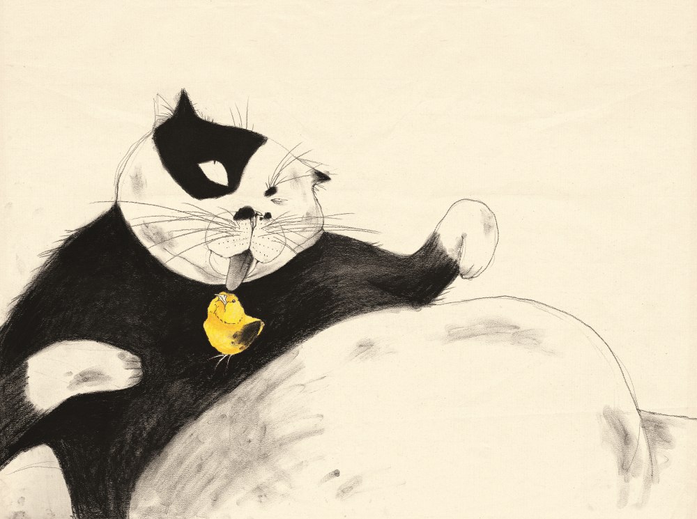 Baek’s picture book worlds open the door to magic and wonder. Nowhere is this more true than in Pi-ya-ghi Eomma (2011, Little Chick Pee-yaki’s Mum), one of just a few books in her oeuvre that is drawn in charcoal and ink. This crazy, quirky tale paints a portrait of parenthood that is both candid and comedic. A cat named Mjahau lives to hunt down, torment and eat up small animals. One day, however, Mjahau swallows a chicken egg and is amazed to give birth to a baby chick. This unlikely event leads to an equally unlikely transformation in Mjahau, who finds a new role in life after accepting responsibility for sheltering and raising little Pee-yaki.