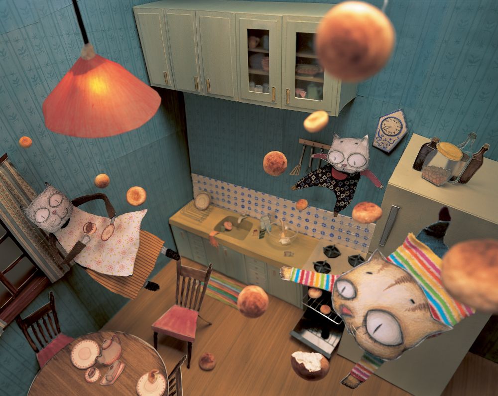 What happens when you eat bread baked of clouds? In her first book, Gu-reum-bbang (2004, Cloud Bread), Baek demonstrates innovation and a desire to find new modes of visual expression. The book’s central characters (a family of cats), their home and the outdoor environments are all fabricated of paper and cardboard, lit and photographed by Hyang Soo Kim. The contrast between the flat paper figures and the three-dimensional spaces creates a dynamic, magic world that draws viewers irresistibly into the story.