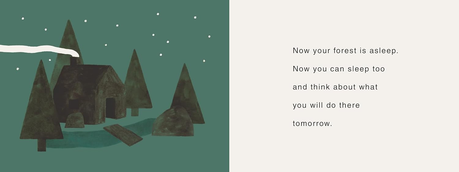 One of Klassen’s ongoing projects is a board book series. While the books are created for very young readers, they also open the door to broader perspectives. The trio Your Forest, Your Farm and Your Island (2025) feature no actors, just nature, landscapes, objects, places, and environments presented in short, factual sentences. Here, Klassen works with unoutlined shapes, and each turn of the page adds something new. The sun, the trees and all the other parts of the forest look at us with big eyes and follow us curiously, sometimes anxiously, through the story. Each book ends with an invitation to readers to make the place their own: “Now you can sleep and think about what you will do there tomorrow.” It is an appeal of an almost spiritual nature. Here, the reader is truly made into a co-creator.