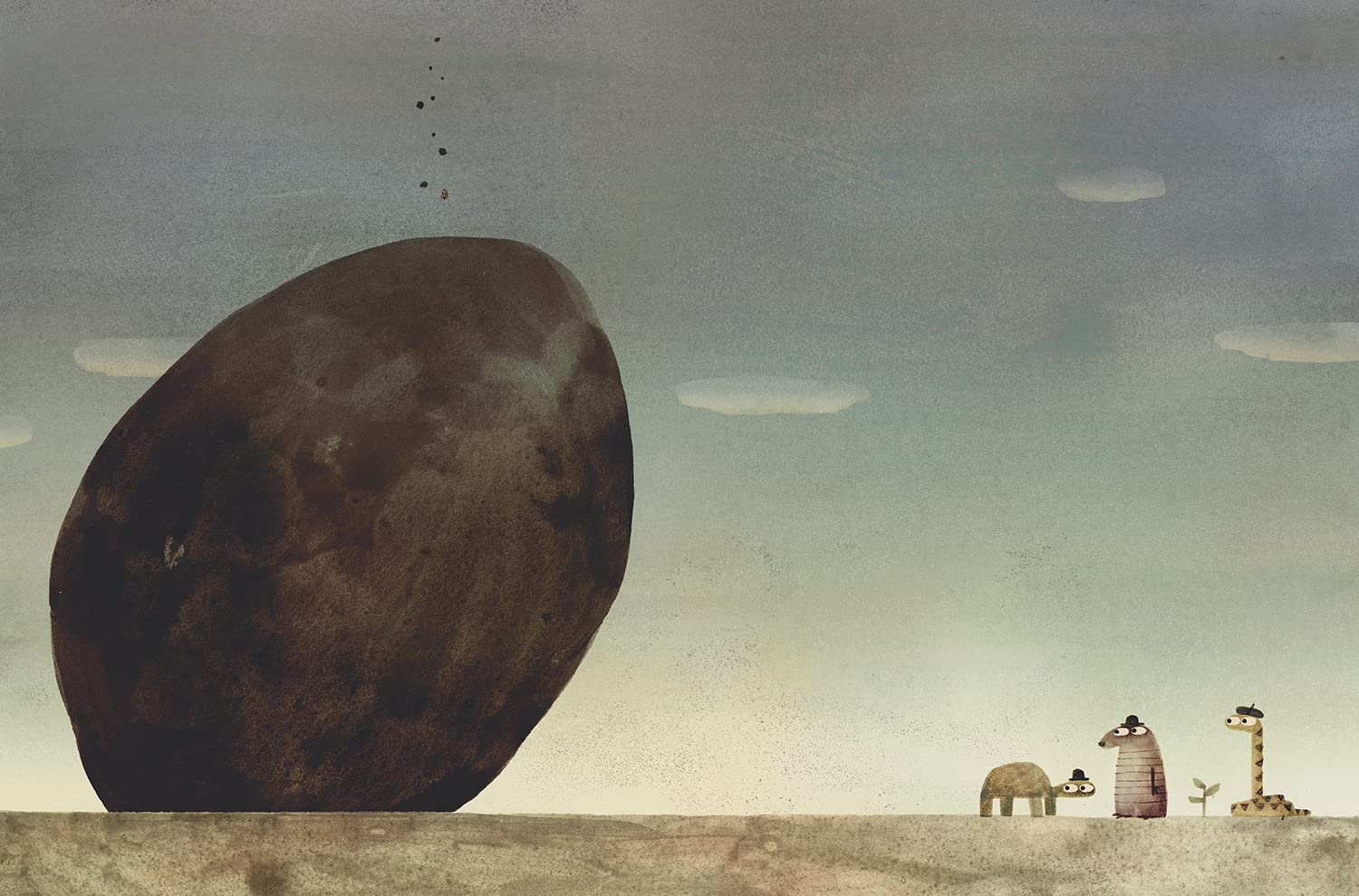 The characters spend most of their time exposed to external circumstances that can be interpreted from more than one perspective. The mole and the turtle imagine the future with their eyes closed, unaware of the approach of a threatening space monster. The terse, funny, absurdist dialogue is reminiscent of a Samuel Beckett play, and Klassen has talked about Beckett’s importance for the book. The grey-tinged palette reinforces a feeling of uncertainty, an indefinite sense of waiting. The five-act structure may also evoke the feeling of being at the theatre, with each act playing out in a new set. In the midst of infinite space, the characters move through a desert-like landscape where low horizons cut off the ground from a darkening sky.