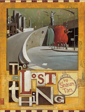 The Lost Thing (2000) är en mångbottnad, surrealistisk berättelse om identitet och främlingskap men också om möjligheter. Vi möter här för första gången Shaun Tan som både textförfattare och bildskapare. Den återhållna texten omsätts i en storslagen visuell gestaltning, som skildrar det sällsamma mötet mellan berättarjaget, författarens alter ego, och en gigantisk varelse som är både klassisk maskin och levande väsen i samma kropp, ”the lost thing”. Redan här uppstår en spänning. Hur kan något så stort och spektakulärt vara borttappat? Ja, nästan osynligt för de flesta. Kan det vara en symbol för upphittarens upptäckt av sin egen inre potential? En fråga som blir ännu starkare när ”the lost thing” får komma hem till berättarens familj och föräldrarna knappt lägger märke till den.