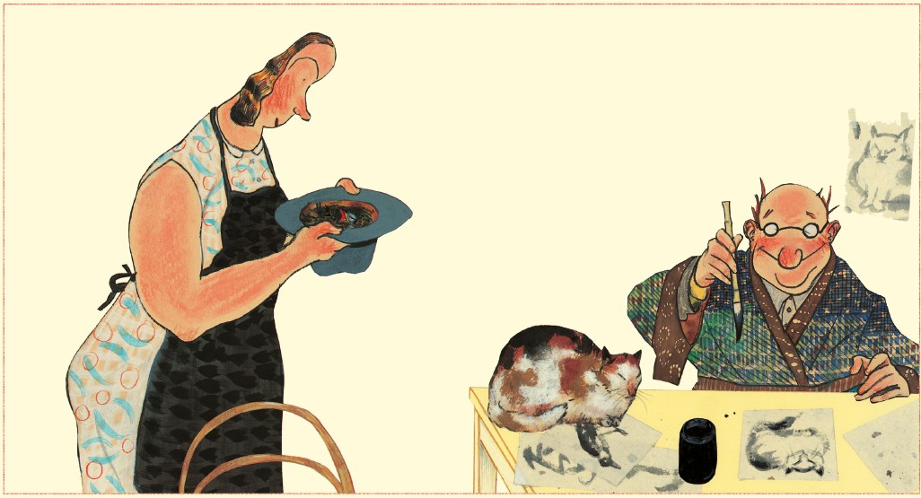 Wolf Erlbruch låter sin teckningskonst blomma ut för fullt i karakteriseringen av de ”förfärliga fem”. Här ser vi en medveten blinkning till Akira Kurosawas film De sju samurajerna med en sparsam miljögestaltning som för tankarna till Asien och japanska träsnitt.