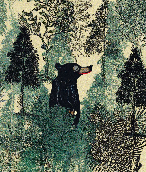 Ett gott exempel på Wolf Erlbruchs förmåga att hitta friska oväntade bildvärldar är Der Bär, der nicht da war (2014, Björnen som inte var där) med text av Oren Lavie. Här möter vi en djärv och mer stiliserad gestaltning av ett av Erlbruchs favoritmotiv, björnen, men färgbehandlingen och inte minst skildringen av skogen känns ny, tidigare osedd och överväldigande. Sällan eller aldrig i en bilderbok har en skog varit så mycket skog, så färgrik, så formrik, grön och doftande.